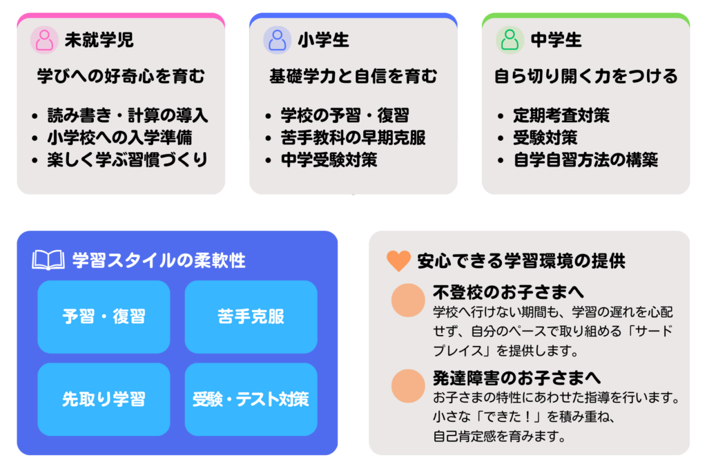 当塾は、未就学児から中学生までを対象としています。個別指導のメリットを最大限に引き出し、集団塾の一律な進度や、自習形式の塾では届きにくい一人ひとりの細かなつまずきに寄り添います。「わからない」を置き去りにせず、一人ひとりの歩幅に合わせた指導で、学ぶ楽しさと自信を育みます。